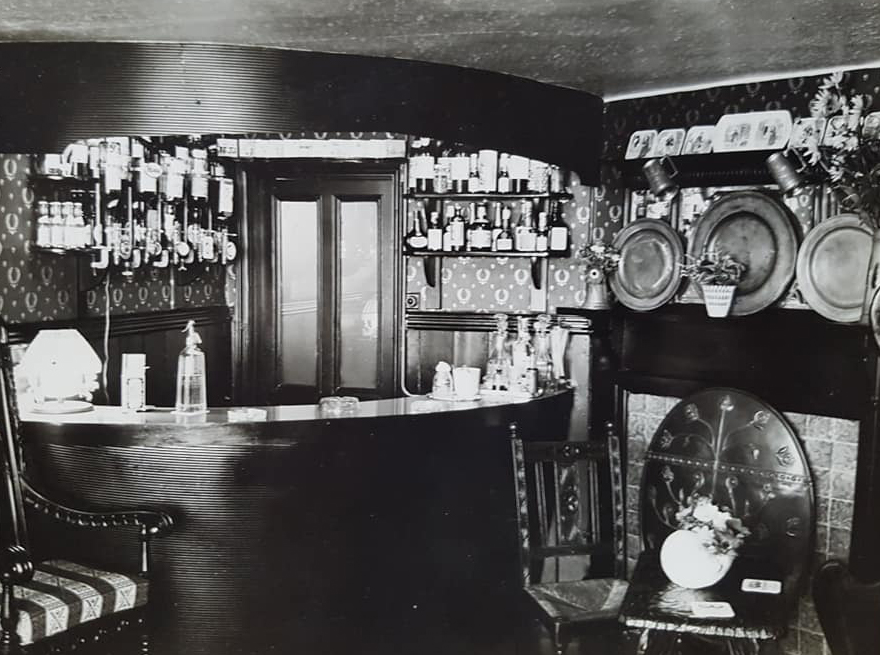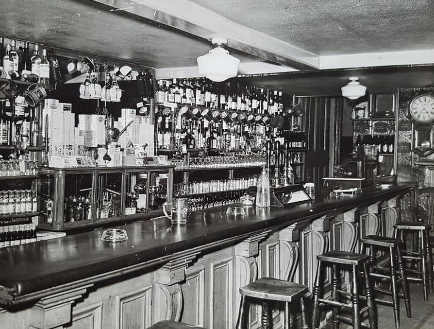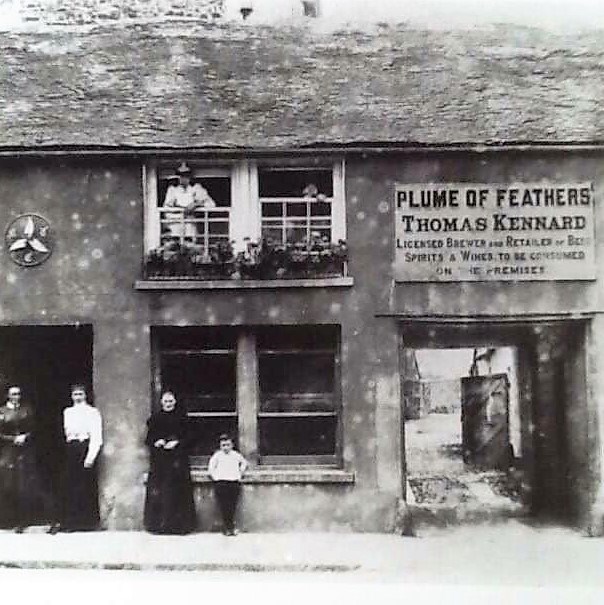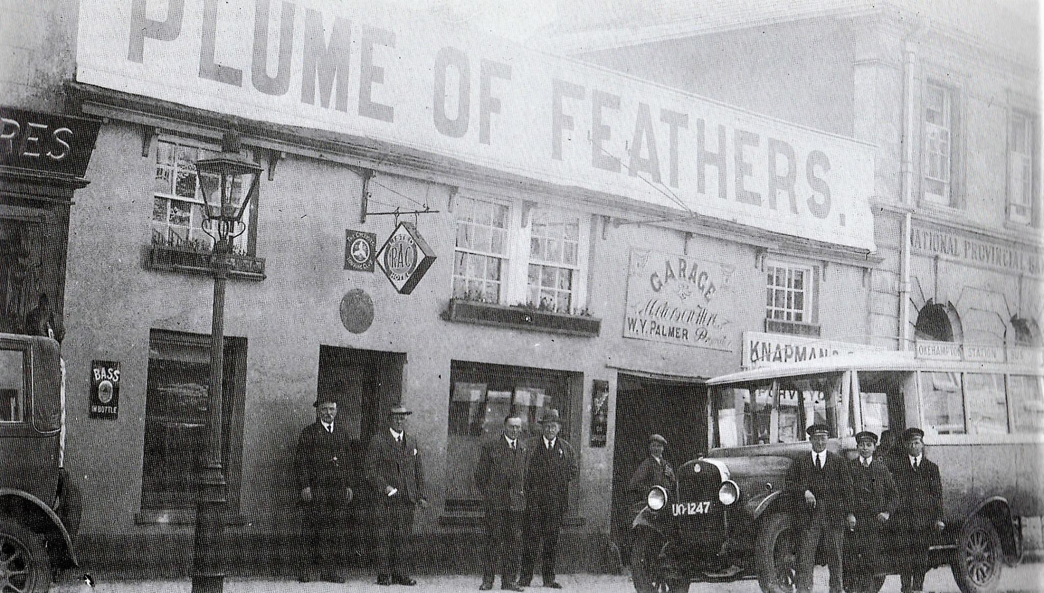 In the 1920s the Plume of Feathers installed this enormous sign. Although the sign was a popular addition, the advertisement was really quite irrelevant. This 1930 picture features two local characters, namely Reg Mason (leaning on the bus) and John Cawse, taxi driver (far right). Both men served in the Auxiliary Fire Service (AFS) during the war. Nick Palmer (third from the left) was the landlord’s son.